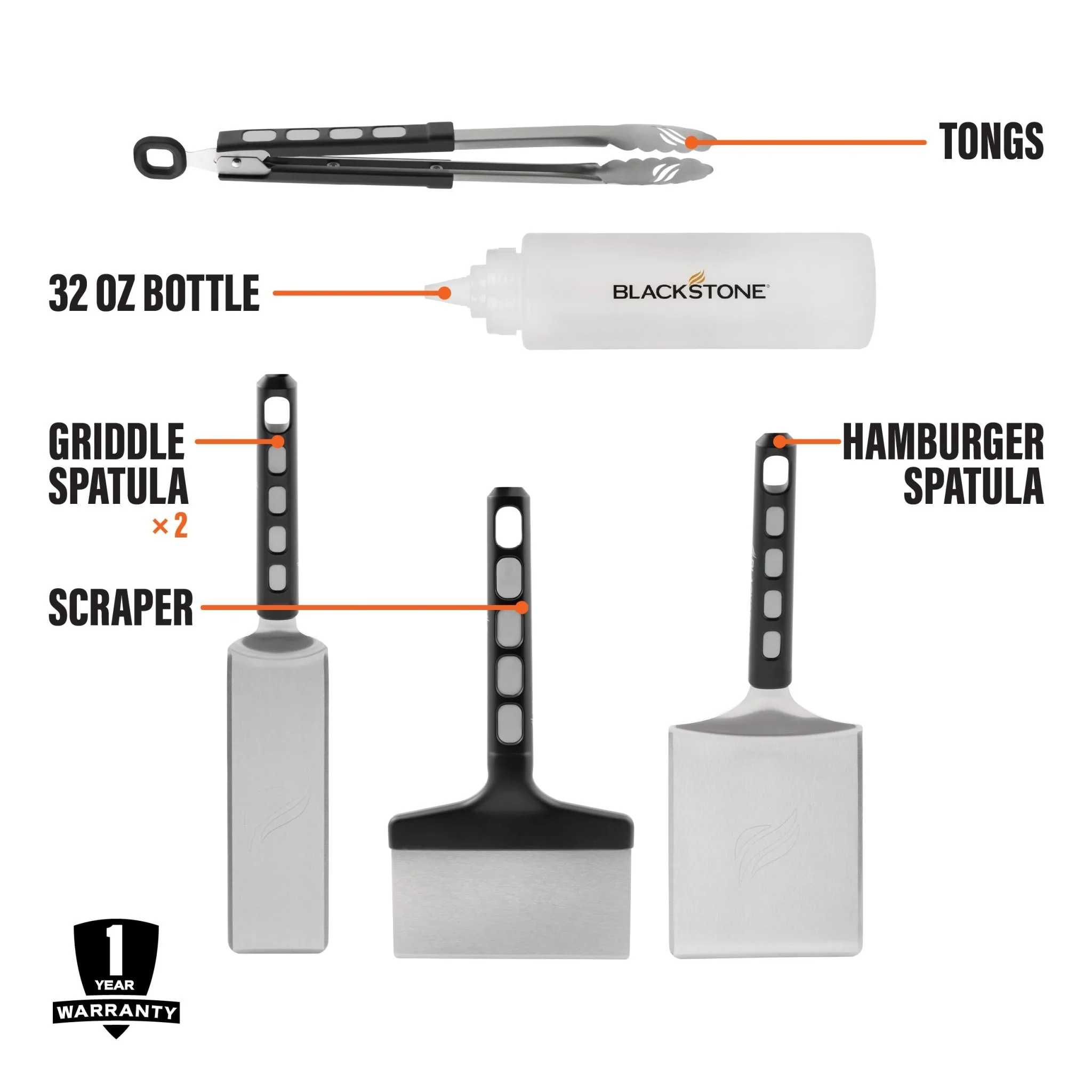The Blackstone Bronco Essential Toolkit comes equipped with everything you need to cook delicious meals anytime. The griddle scraper is a must-have cleaning tool paired with the 32oz squeeze bottle for loosening up those stuck-on messes. The spatulas and tongs make flipping and turning easy, so youāll be cooking breakfast, lunch, and dinner in no time!